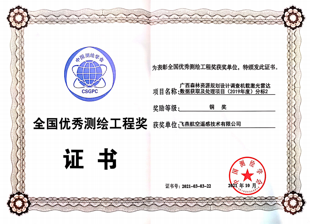 森林是人類的搖籃,發(fā)達的林業(yè)是國家富裕、社會文明的重要標志。飛燕遙感承接的“廣西森林資源規(guī)劃設計調查機載激光雷達數據獲取及處理項目(2019年度)分標2”助力廣西林業(yè)分析,摸清“家底”,榮獲2021年度全國優(yōu)秀測繪工程獎銅獎。