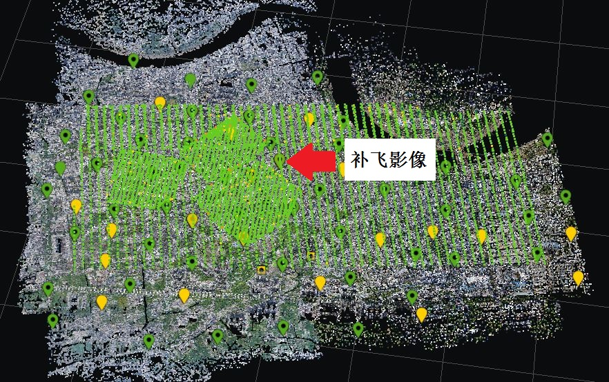 原數(shù)據(jù)空三與補(bǔ)飛數(shù)據(jù)空三可分別進(jìn)行,可加快項(xiàng)目進(jìn)程,提升效率。在實(shí)景三維重建環(huán)節(jié)將兩部分?jǐn)?shù)據(jù)進(jìn)行融合,通過(guò)生成的點(diǎn)云信息檢查數(shù)據(jù)融合效果。