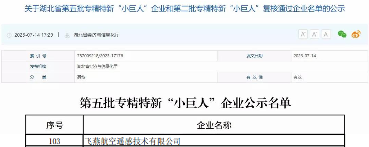 近日,湖北省公示了第五批國(guó)家級(jí)專精特新“小巨人”企業(yè)名單。經(jīng)過一系列嚴(yán)格的評(píng)審篩選流程,飛燕航空遙感技術(shù)有限公司憑借在科技創(chuàng)新能力、核心技術(shù)實(shí)力、行業(yè)影響力、高質(zhì)量發(fā)展?jié)摿Φ确矫娴耐怀龀煽?jī),榮獲國(guó)家級(jí)專精特新“小巨人”企業(yè)稱號(hào)。