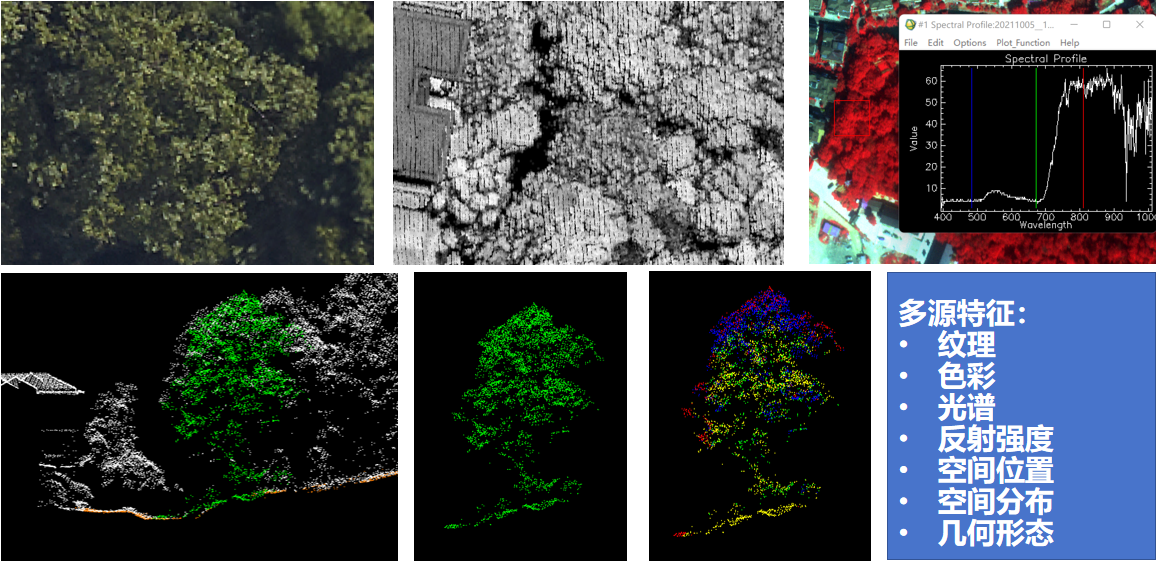 在智慧林業孿生建設中,基于飛燕遙感多模態數據,時空同步的高光譜影像、激光點云結合少量的地面或街景影像,即可自動化、大范圍快速生成單體化樹木三維模型場景。激光點云提供幾何信息,高光譜影像進行樹種識別,通過實測樣本庫自動匹配樹種三維模型,從而達成樹木模型的批量構建,并具備測繪學意義上的幾何與屬性精度。