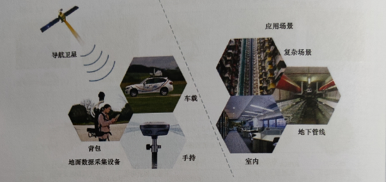 針對城市中復雜場景、室內、地下管線等衛星遙感以及航空攝影手段難以獲取數控的對象,可在地面進行數據采集,如圖 2-2 所示。實景三維地面數據采集主要有車載背包、手持等方式,通過將激光掃描儀、影像采集設備、定位定姿設備、同步控制器等多傳感器集成于一體,并根據采集需求將設備搭載在測量車上,對建筑、道路進行高精度實景三維數據采集,或通過背包、手持的方式對室內室外、地下管線進行數據采集。